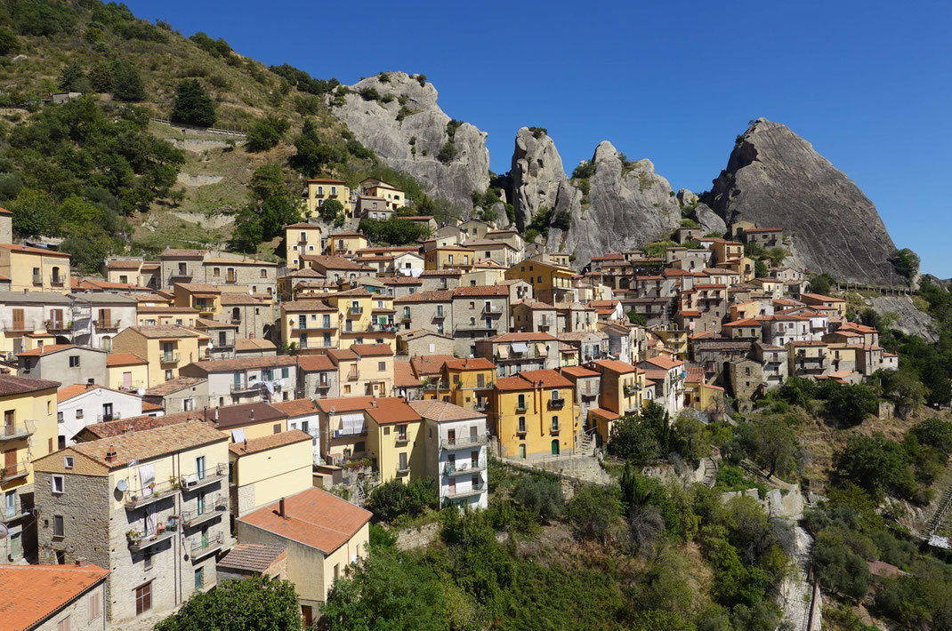 der spektakulären Felslandschaft der Lukanischen Dolomiten. Charakteristisch sind die steilen Treppen, engen Gassen und dicht an die Felsen gebauten Häuser, die dem Ort ein märchenhaftes,